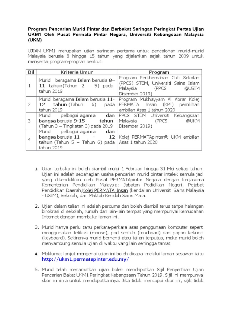 Masa sekolah rendah ada masa sekolah menengah pun ada. Ujian ukm1 merupakan ujian saringan pertama untuk menyertai program program berikut. Asalkan ada laptop dan line internet. Permata pintar ialah satu program pendidikan untuk memenuhi keperluan pelajar pintar dan berbakat.